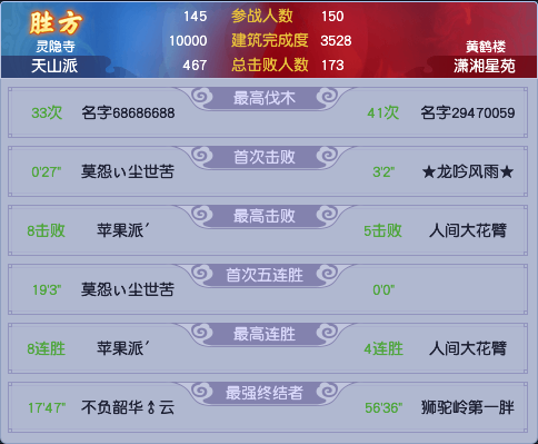 这场比赛一方面是两个帮派的实力有一定差距,另一方面是潇湘星苑的战术制定存在问题。潇湘星苑希望利用红色方优势以守为攻,可是却在比赛初期被天山派攻破防线,之后潇湘星苑并没有特别有效的临场决策,让天山派较为轻松的拿下了比赛。