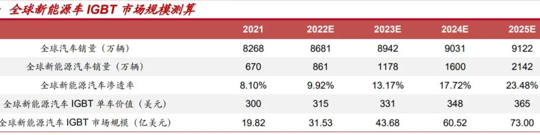 IGBT作为逆变器等系统部件的核心器件,需求快速增长。普遍测算,全球新能源车IGBT市场规模将从2021年19.8亿美元增长至2025年73亿美元,平均增速达38.5%。