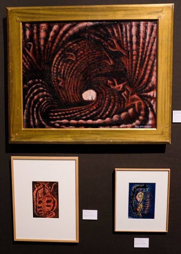 上:《堆积的尸体》,1950, 油画与瓷漆, 72.3 x 91.5 cm。左下:《动物》,1952,水粉和粉彩,27.0 x 18.7 cm。右下:《两颗种子》,1952,粉彩和墨水,27.0 x18.7 cm