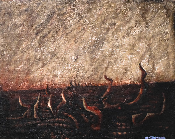 这个时期的草间弥生还未完全脱离“写实”,作品处于具象和抽象之间。但此时已经呈现曲线、漩涡和点状图案。作品标题也多是具象的物体,例如《树》、《花蕾》等。作品大都以红色和黑色作为主色调,把画面氛围烘托得非常不安。草间似乎更希望让观众融入到她的世界里,感受她的情绪。正如其所说:“我画画是因为我无法用语言表达。”