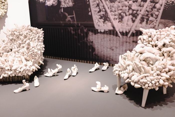 60年代初,草间弥生对填充织物的迷恋达到了巅峰。白色的填充物附着在沙发,椅子,梯子,鞋子等日常物体上,形成了超现实主义的空间。