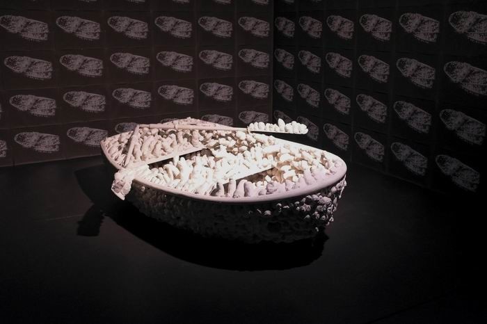 《集合体:千船展》,1963,划浆船与白色填充物,60.0 x 130.0 x 265.0 cm。使用棉花等复合材料做出了无数个白色的根状物体,暗示着性。创作于她人生中低谷的时期,这也是她最早的堆积风格作品。