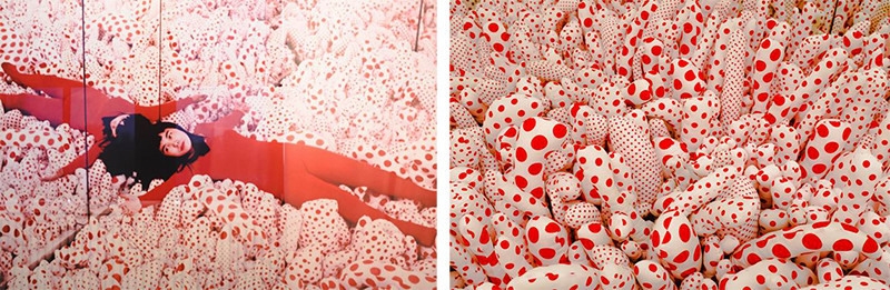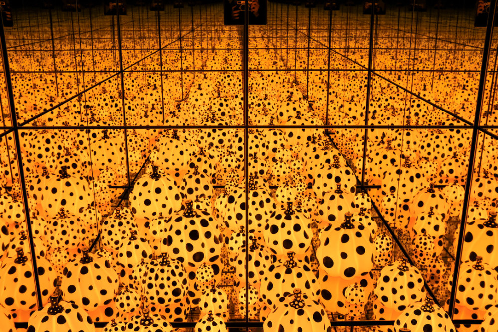 在无限镜像空间里置放着无数的波点南瓜,这是她延续镜像空间系列的作品。一个密闭的六边形空间,参观者通过一个小窗口窥视这个无限空间,称为《窥视秀》。