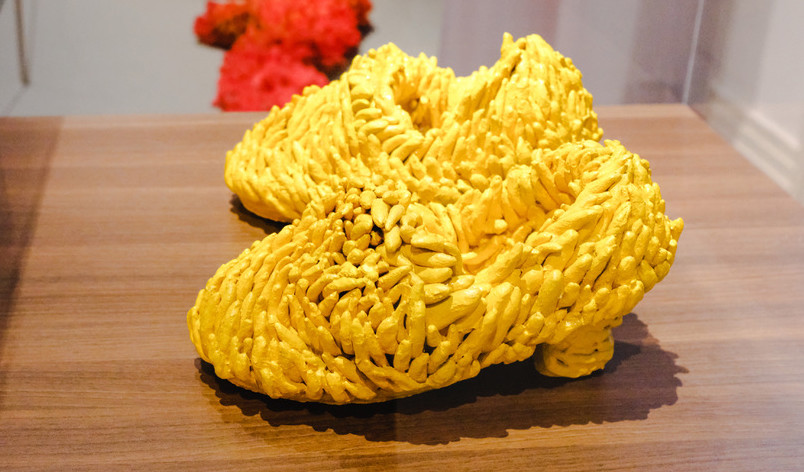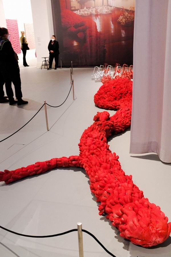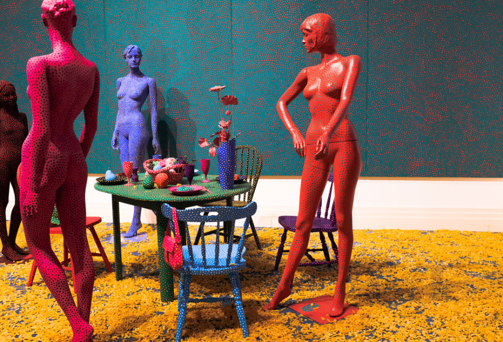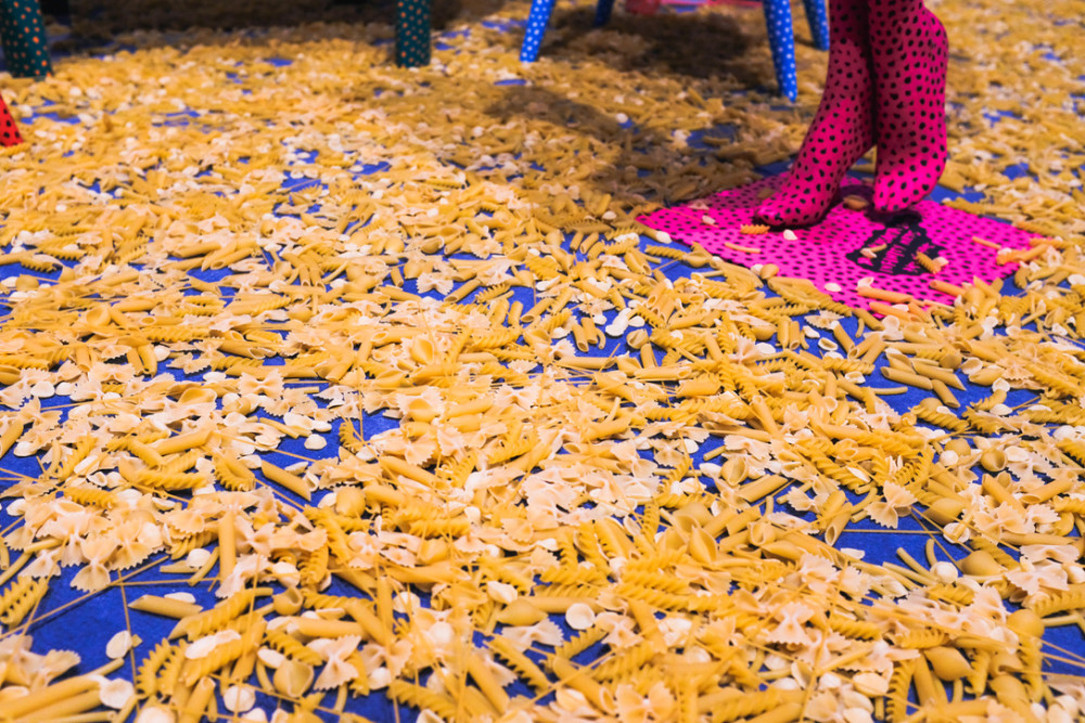 在这个作品里,色彩缤纷的人体雕塑上的覆盖着网点,地上的意面也是无限网点的延伸。草间弥生把意大利面铺在地板上,体现她所描述的“对食物的迷恋”。