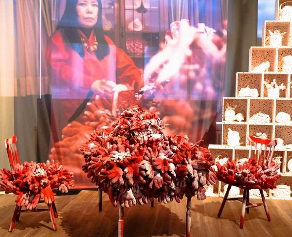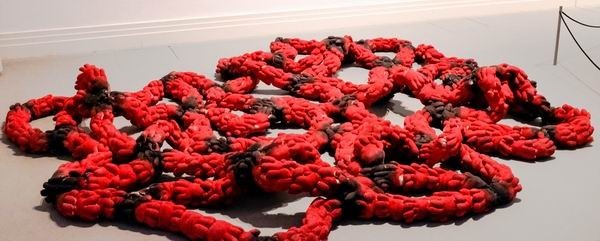 草间弥生运用了大量的填充手套塑造出不同的物体,比如匍匐在地上的生物,绳索,餐桌盛宴等。重复的手套展现着草间的堆积艺术风格特点。手套在这里寓意着手的触摸,暗示着一种亲密关系。通过“触摸”这些日常的物体达到抹去自己的个性并融入其中的理想境界。
