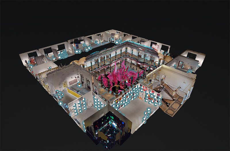 展厅中,黑色波点荧光粉的巨型充气装置在这次展览中最为醒目。马丁-格罗皮乌斯博物馆内部是新古典主义的建筑风格,柱廊和墙面雕花都展现着强烈的欧式风格。但荧光粉色的装置作品却打破了这种空间的寂静感,如同一股新生力量向上攀爬。