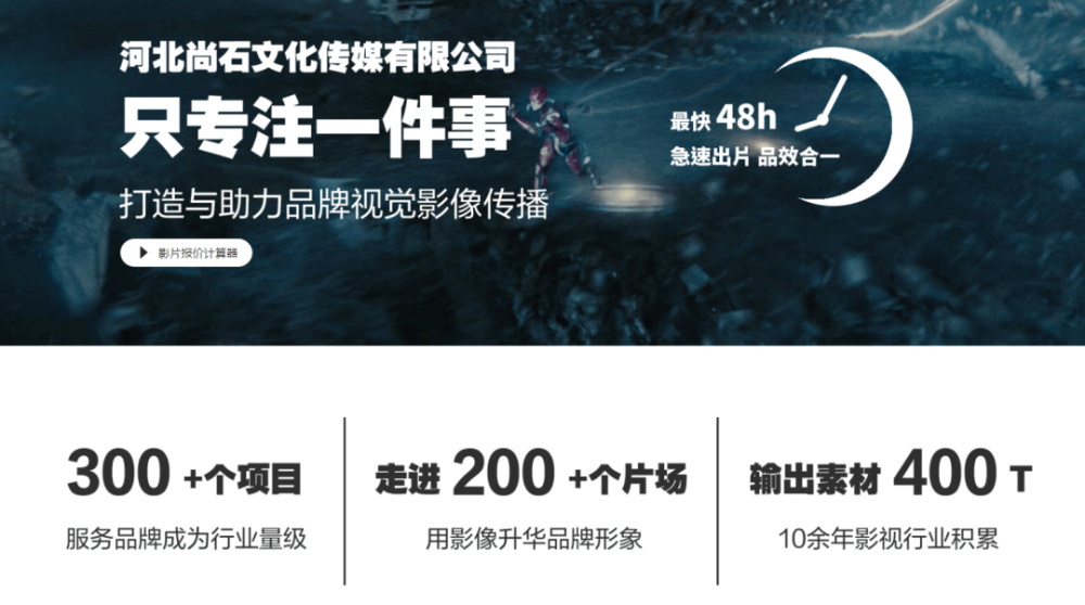 尚石影视专注于影视创意和技术,致力于将品牌理解和艺术灵感利用视频影像等手段,全方位多角度的向公众展示推广,集前期创意,中期拍摄,后期制作为一体,是河北省较早进入影视后期制作行业领域的企业之一。承接包括三维视觉动画、电影、电视剧、多媒体互动演示设计、宣传片广告、短视频、教育课件视频、电商短视频等后期制作项目。涉足的领域有电影、电视剧、MV、广告、宣传片、真人秀节目、网络大电影等后期制作。公司拥有强大的创作团队和制作班底,引进先进的后期设备和技术,公司的宗旨是“打造专业团队,服务至上”的宗旨,为客户提供优质的后期制作服务,给行业输送更多的人才。