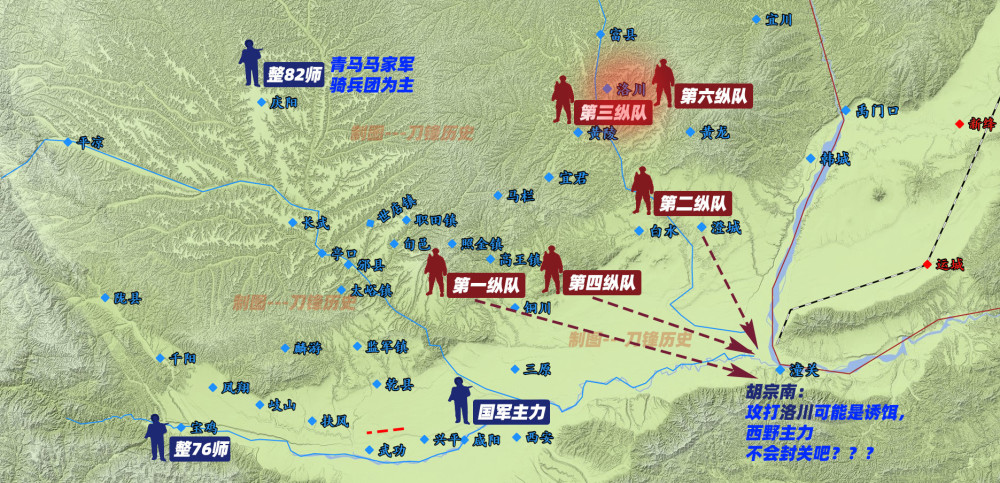 因为随着西野第一、第二、第四纵队南下至铜川、白水、合水一带,胡宗南料想,西野此次南下打洛川虽是必然,但会不会和上次攻打宜川一样,宜川只是诱饵呢?