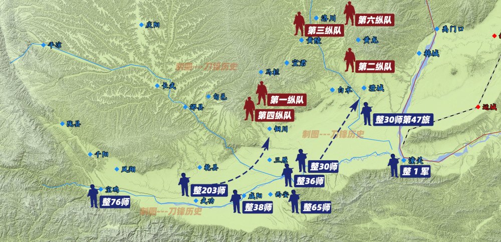 第四纵队、第一纵队抽调一部控制铜川以北的金锁关和宜君县城,主力则隐藏在铜川西北、东北地区,准备打援。