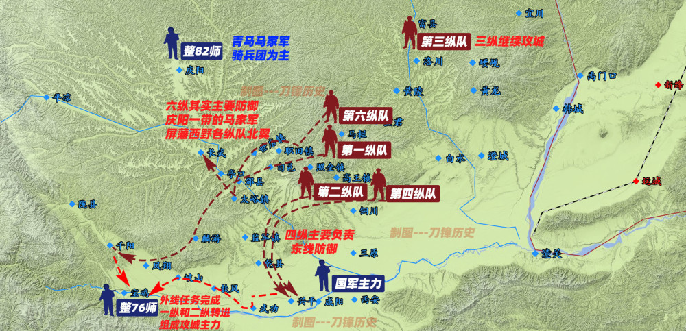 左路,由第二、第四纵队组成,在张宗逊指挥下,从高王镇以南渡泾河,夺取监军镇、乾县,得手后以一部相机夺取醴泉、兴平,向咸阳佯动,威胁西安;(完成任务后二纵转进至宝鸡)中路,由第一纵队担任,夺取旬邑,从张兰镇渡泾河,向千县(似是千阳县)、麟游、凤翔挺进,协同第二纵队相机夺取宝鸡;右路,由第六纵队担任,夺取职田镇、世店镇、太峪镇等据点后,由亭口、千县(似是千阳县)间渡泾河,视情况相机使用。主力迅速夺取武功、扶风、岐山,相机夺取宝鸡,并彻底破坏武功兴平段铁路,准备炸毁渭河桥梁;