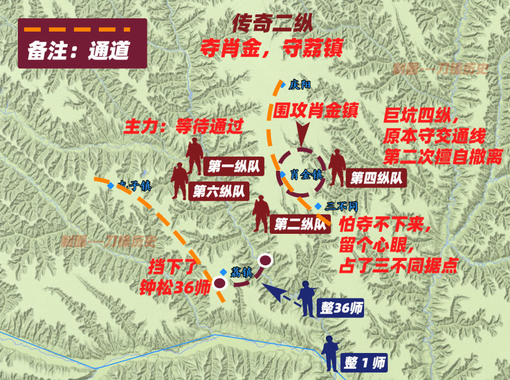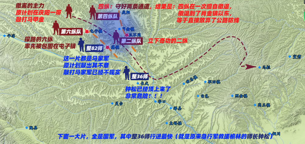 张宗逊当时一面要打掉肖金镇的马家军,一面还要保护刚占领不久的荔镇,还要阻击从南面而来整36师,整36师后面还紧跟着整1师。