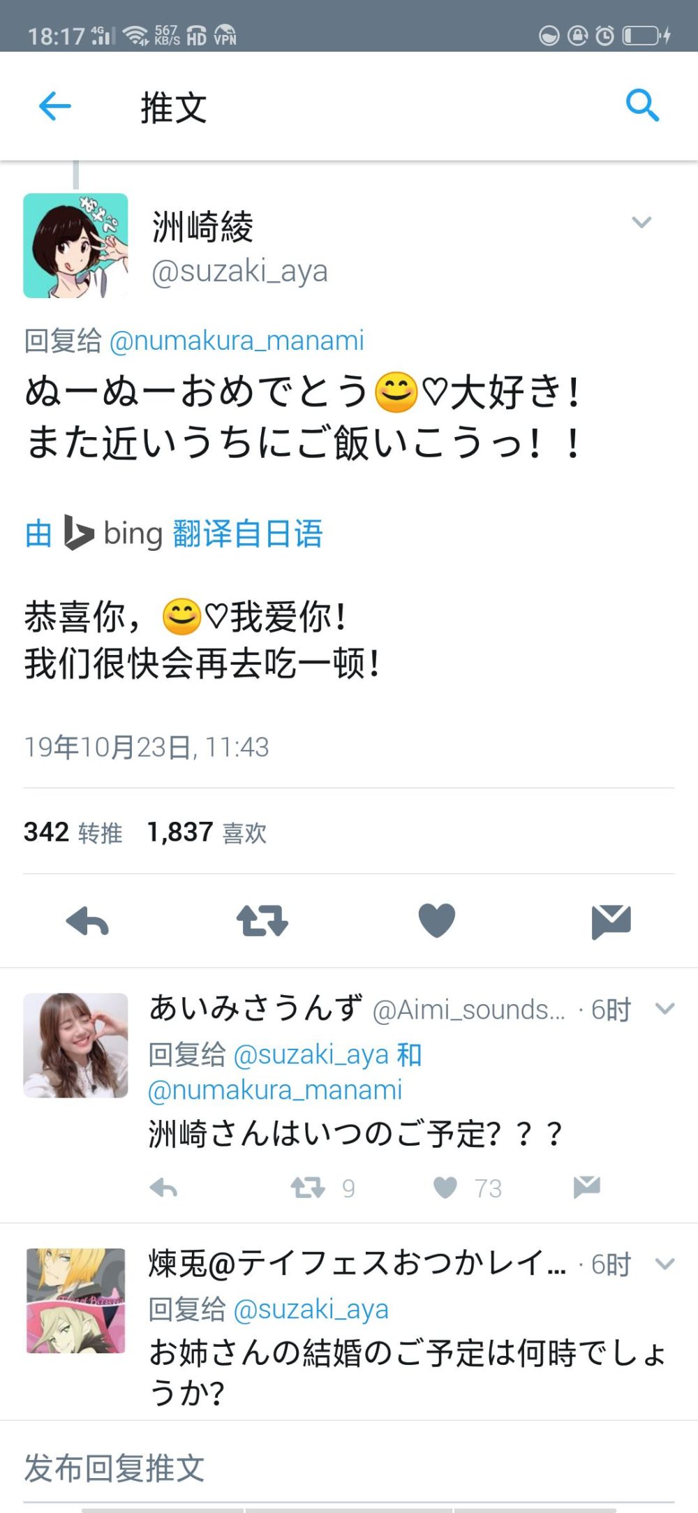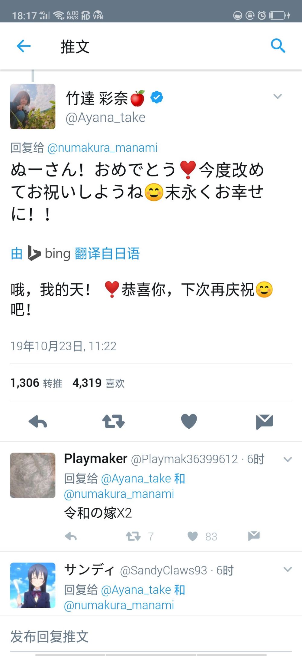 有人给彩喵回了一句「令和的嫁X2」,感觉特别应景呀,彩喵也是今年结婚的,令和元年结婚,是不是声优们都想趁这个特别的时间结婚呀。