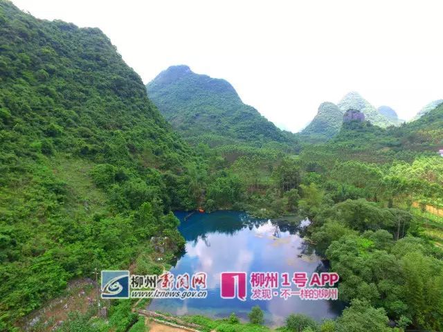 碧绿的潭水,清澈见底。青山环绕,倒映水中。从高空往下看,这碧绿的水潭就像一块镶嵌在山间的碧玉,这便是“柳版九寨沟”十大景点之一、位于水源村的“柳州天池”狼口泉。