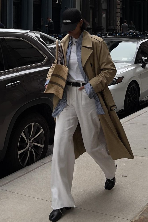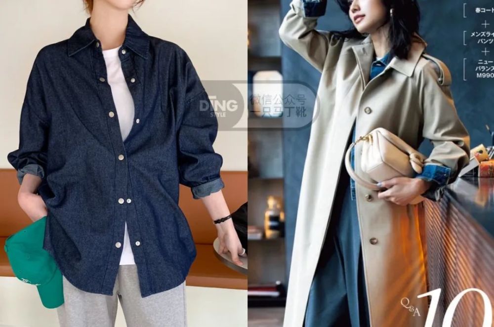 特别是叠穿风衣、大衣这种正式的单品时,牛仔衬衫能把端庄大方和休闲酷飒两种感觉平衡得很好。