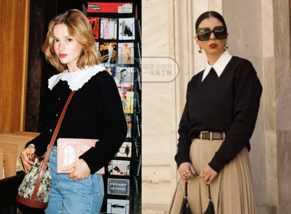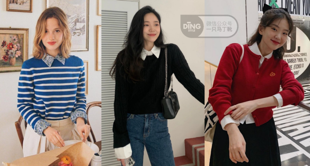 除了关注毛衣领口,衬衫领也可以让叠穿变得更有趣,领口有特别设计的,比如娃娃领、长尖领,都能给整套搭配增加一些精致度。