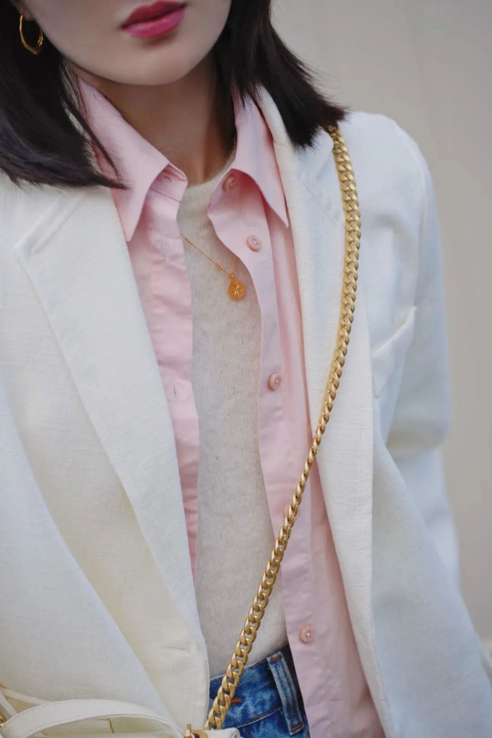 上次我在 Dingslook 里穿的这套就是用了这个叠穿公式,粉色衬衫+白打底衫+米白西装,保有正式的同时,也有彩色穿搭的时髦感。