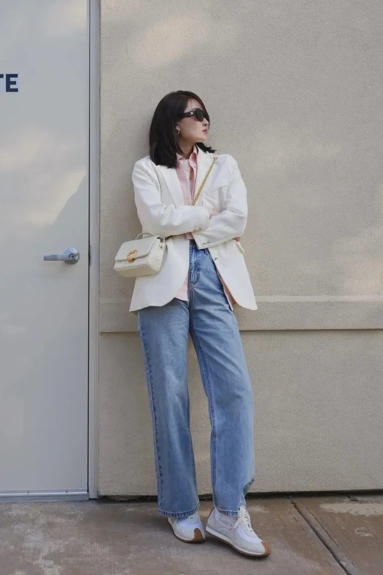 蓝色衬衫+白色打底也很日常,一看去就清清爽爽,时髦不夸张,休闲和职场两种场景这么穿都很合适。