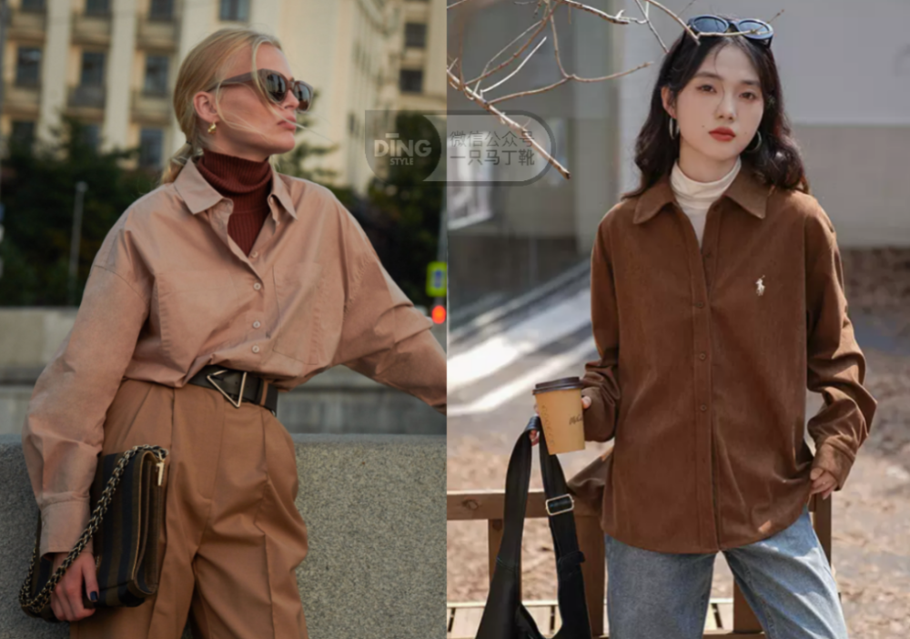 但如果衬衫穿在外面,露出来的比较多,就最好挑简单基础色的,比如万能白色、米咖色、燕麦色,会很方便后期继续叠穿外套。