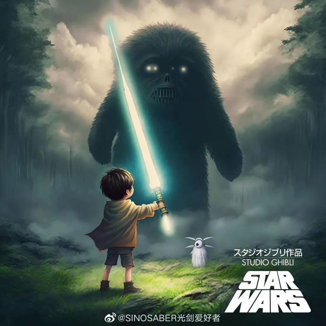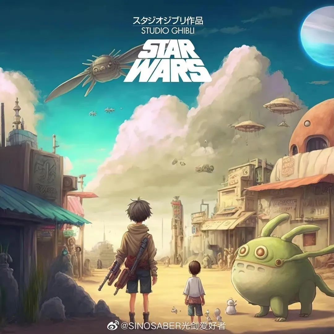 现在不是流行AI生成画嘛,然后第二天就看到有人用AI去生成出了一个吉卜力X星球大战的AI作品: