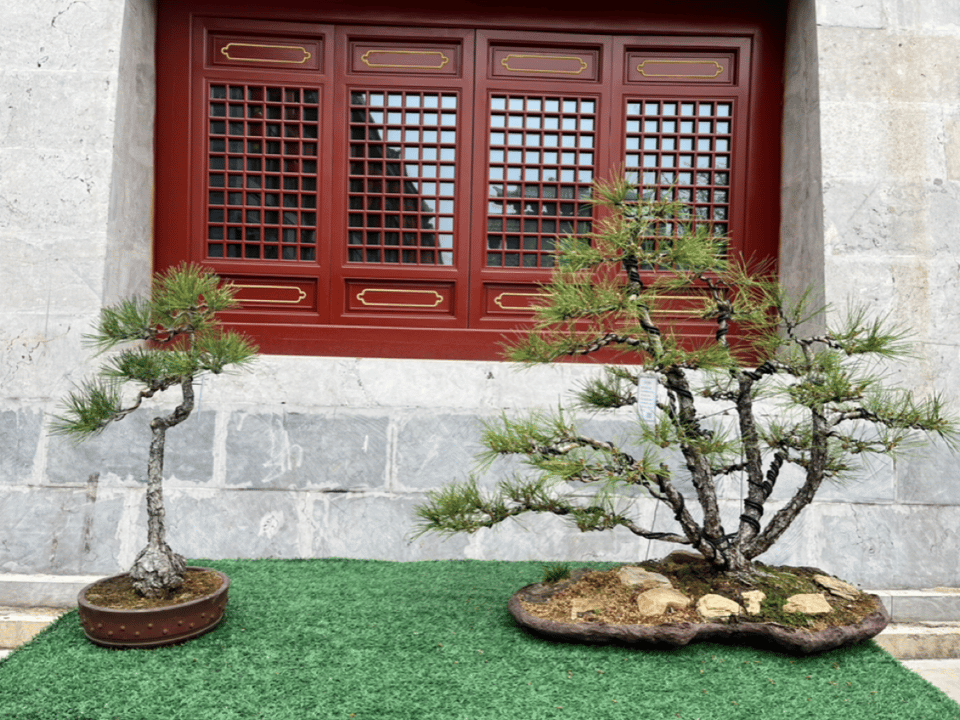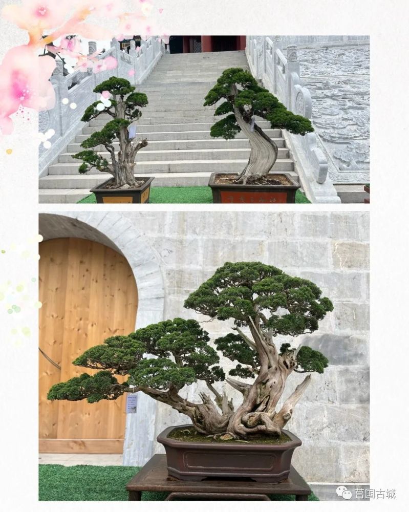盆景展区分布在文昌阁周围,以松、柏、黄荆为主的精美盆景次第摆放,既有美的艺术造型又包含着美的思想意境,像立体的画、无声的诗,缩龙成寸、小中见大,细细观赏很有韵味。
