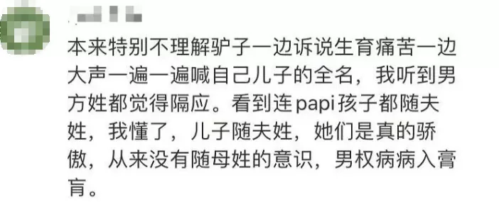 说到底,孩子跟谁姓,就代表了另一方的奴性么?那我不禁要问,是不是那些孩子跟妈妈姓的,又要去嘲讽爸爸的奴性,说没有男人的威风,连孩子的姓名权都丧失了?