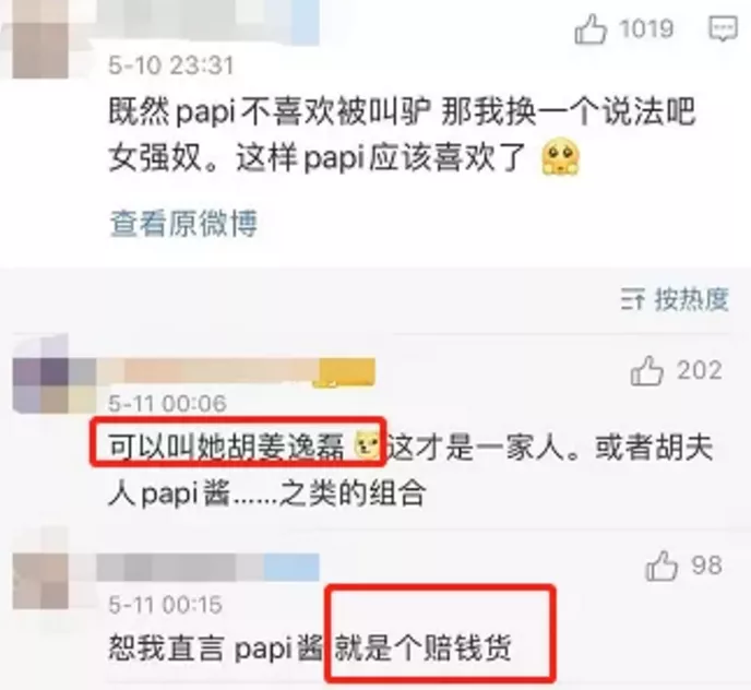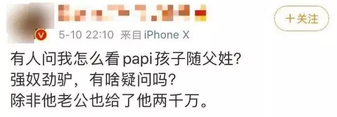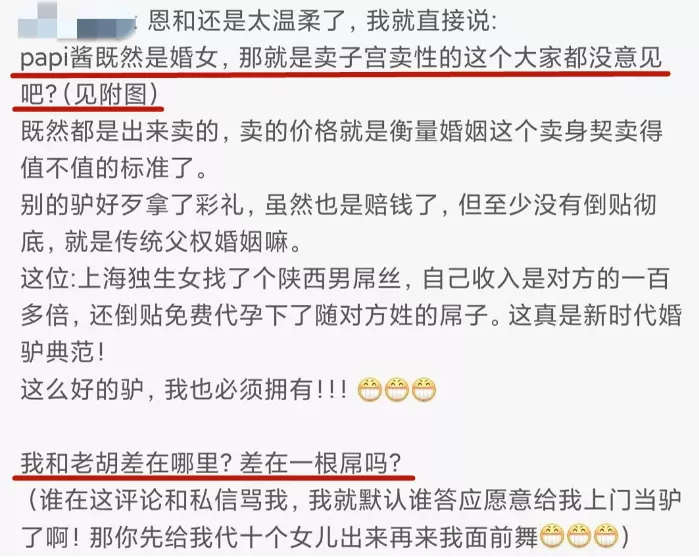 这个评论里,还说到因为papi酱结婚没有收彩礼,说她是倒贴免费代孕。嘲讽人家是“婚驴”典范。
