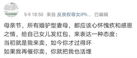 他们认为:婚女=卖子宫卖性。所以照着逻辑,咱们所有结了婚的女性,包括这个群体里每个人的母亲,都是他们口中的“婚驴”,也都是他们口中的“卖子宫卖性”。