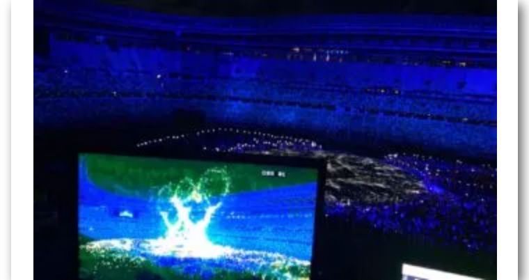 大屏幕上,不计其数的光粒凝聚成闪闪发光的奥运五环。诺大的会场内,啥都没有。