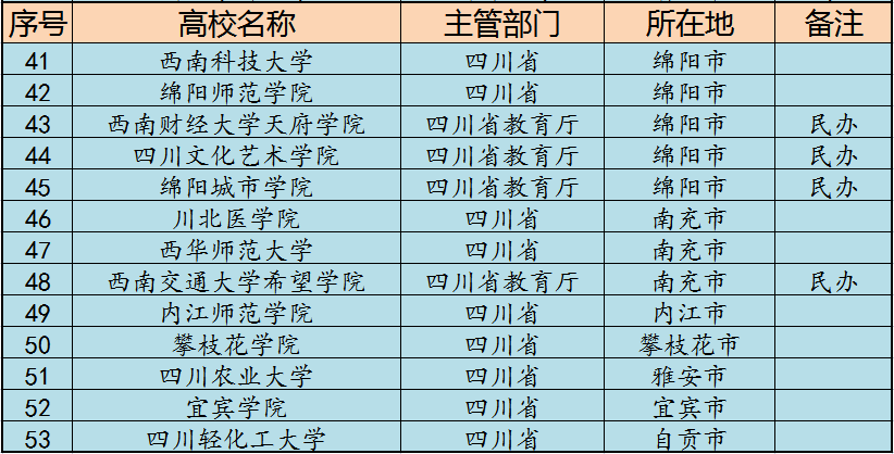 从办学性质看,公办本科35所,民办18所;从主管部门看,部属高校6所,省属高校47所;从所在地看,53所高校分布于16个地市(广元、遂宁、广安、巴中、资阳五地市没有本科院校),下面我就分地市简单介绍一下。