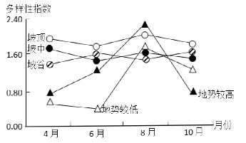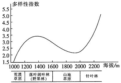 下图示意我国某河谷北坡植物多样性指数随海拔的分布变化。据此完成下面小题。