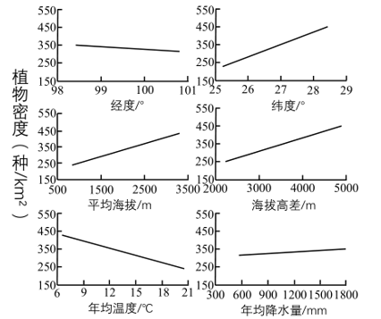 【详解】(1)该地区生物物种丰富主要从该地区的气候的复杂性、生物生存环境的多样性等角度回答。根据图中纬度信息可知,该区域所处纬度较低,热量充足,且地处我国西南地区,降水充沛;同时,该区域山高谷深,加之所处纬度较低,所以气候的垂直差异显著,生物的生存环境多样,所以生物多样性丰富。