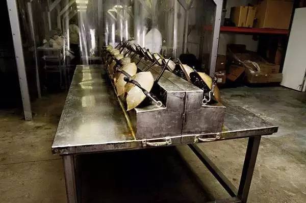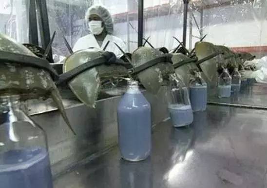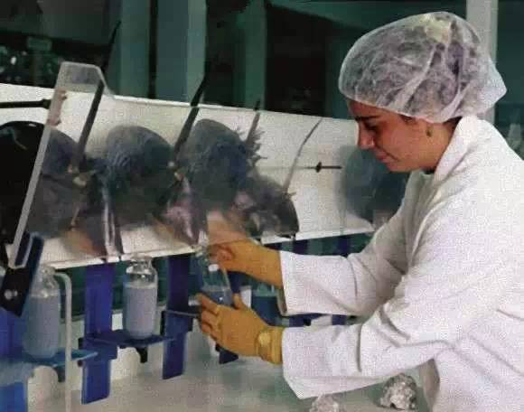 每只鲎都将被固定,然后他们使用不锈钢针刺入鲎的心包以提取输往心脏的含氧血。每个消毒瓶大约能收集到100毫升的血液。