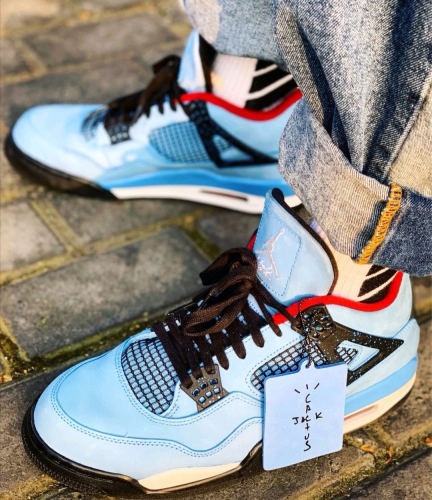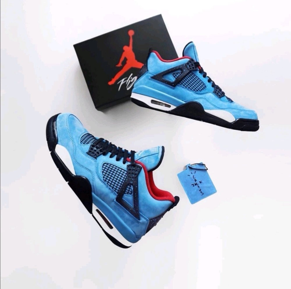 此款 Air Jordan4 Travis scott联名/蓝麂皮配色,以休士顿橄榄球队 Houston oilers为配色灵感,鞋身由黑蓝双色打造,泼墨后跟点缀 Travis scott的唱片厂牌Cactus jack"标志,细节的注入,更是彰显着其独特的联名身份。
