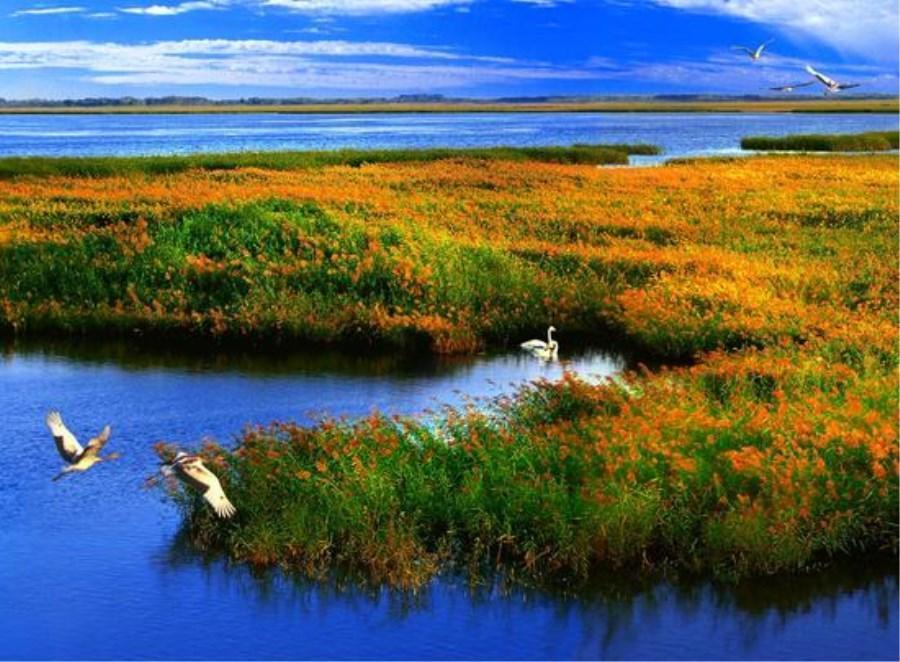 乱苇曲桥莺啭远,清湖碧水鹤鸣幽。