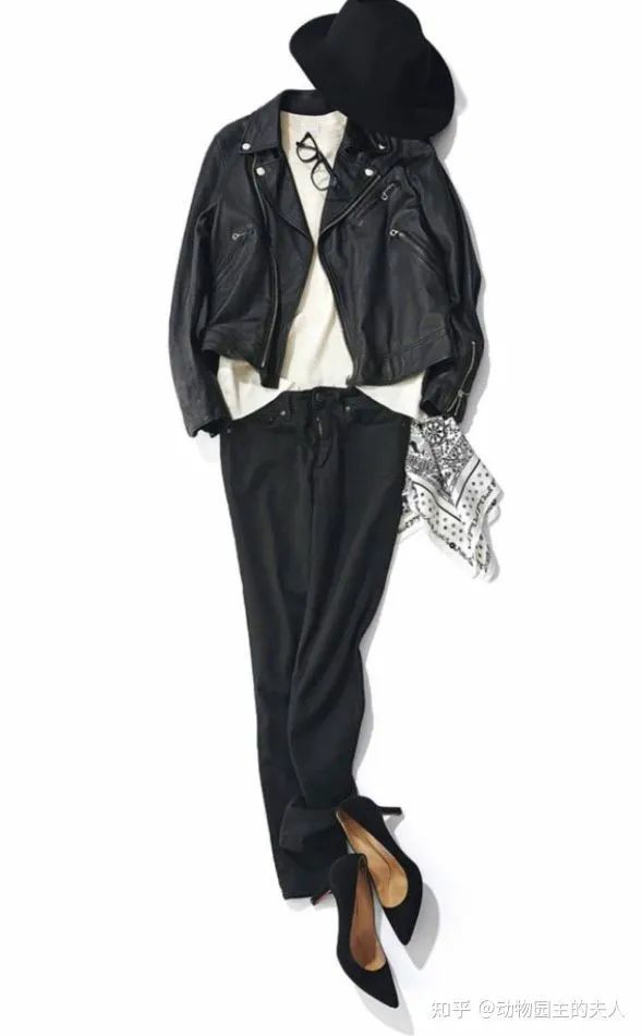 第二套机车皮衣搭配就比较休闲和优雅了一些,内搭换成了套头衫,加入了Emiri的代表性配饰牛仔风格的礼帽,而且换成了很女人味的高跟鞋,这一套也适用于工作性质比较时尚摩登的女性参考。
