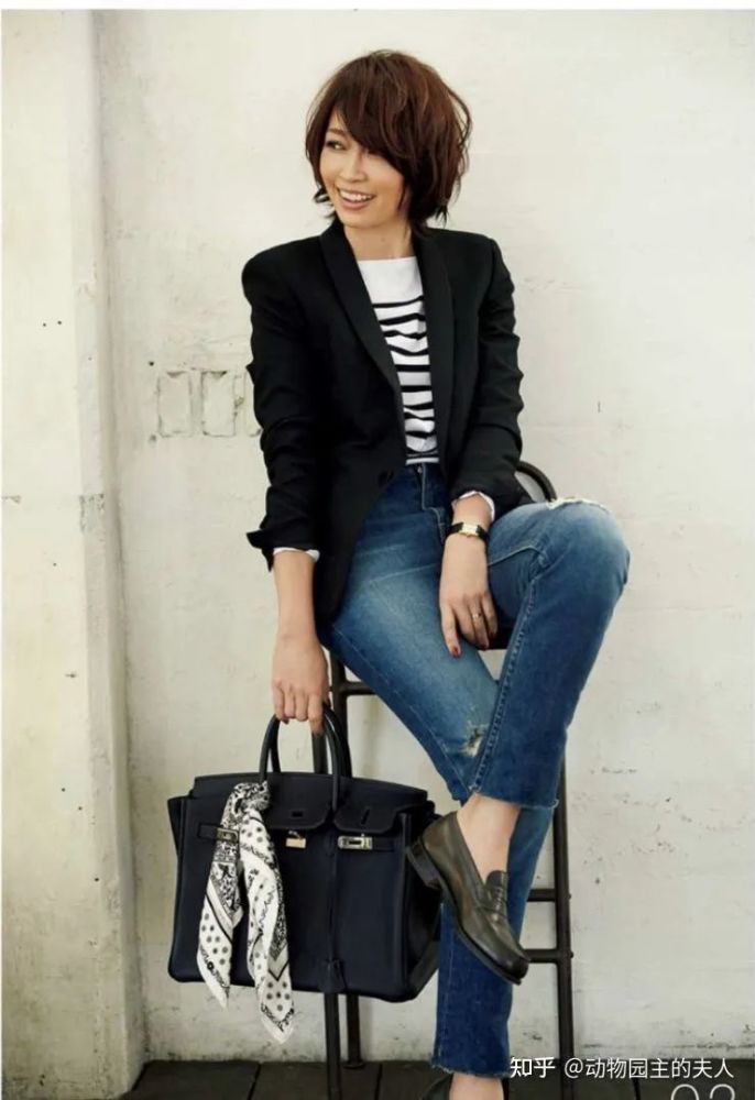 Emiri的西装搭配给出了许多场景。面的西装搭配+条纹+丹宁裤,很适合休闲帅气中性风的女性,而且这一套很适合35+的女性选择。
