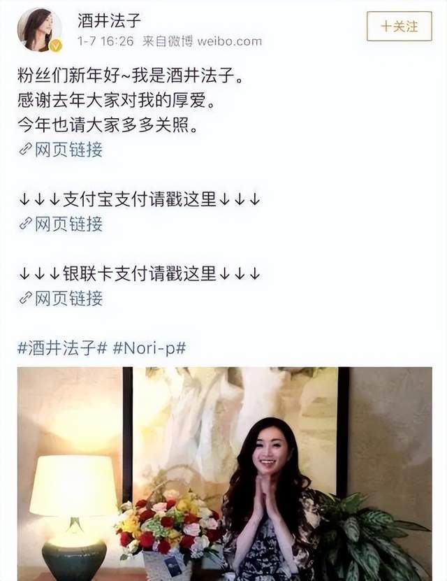 更让人难以接受的是,2019年初,酒井法子竟然打着感谢中国粉丝的幌子,在社交平台上推送了一条要钱的广告,里面还包含着各种付款方式的链接。