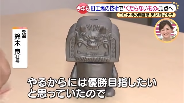 「千成工业」也获得这次无聊发明大赛的冠军,然而冠军奖杯不仅是马桶盖造型,还能够当成帽子,还会发出绿色的光芒(?!)