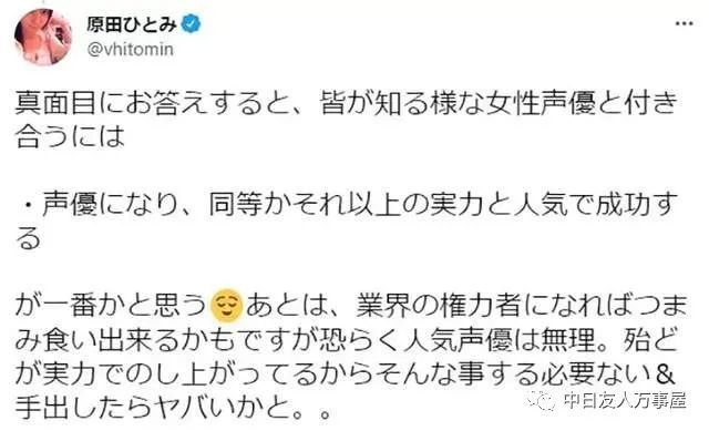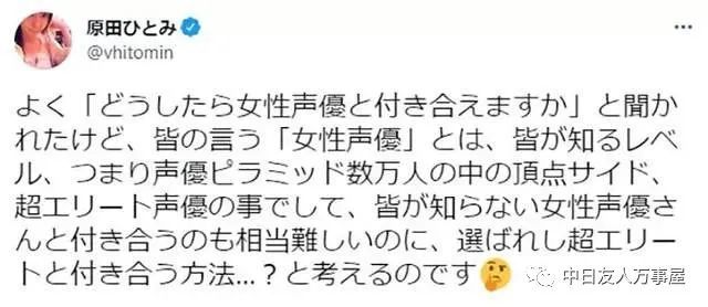 原田瞳(原田ひとみ)开门见山就吐槽,宅宅们常挂在嘴边的「跟声优结婚」通常不是从事声优行业就行,而是专指是有名的顶尖声优。