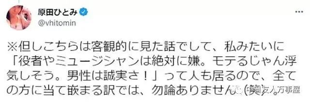 「以上我所说的都只是基于客观分析。毕竟也有像我这种,认为『绝对不想跟演员或音乐家交往,因为感觉很受欢迎很容易外遇,男人还是诚实最重要!』的人存在,所以不能一概而论啦(笑)」