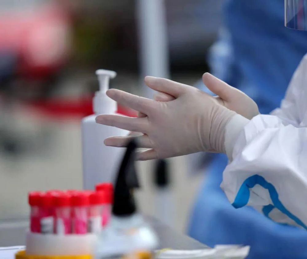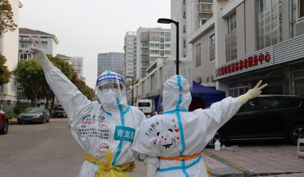 △青龙苑北区医务人员入户采样中。把祝福写在身上,摆出胜利的姿势,为封控小区高三考生加油!