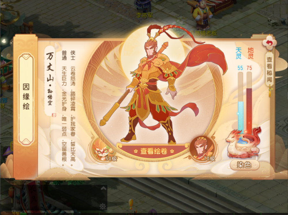 孙悟空因缘绘副本全新登场!随着花果山门派入世,百晓仙子也终于将“因缘绘·孙悟空篇”呈现在了三界少侠们的眼前!本次因缘绘的主角自然是齐天大圣·孙悟空。在成为齐天大圣,甚至是美猴王之前,这只仙石孕育而生的石猴究竟遇到了谁,发生了怎样的故事?让我们拭目以待。对应副本为:二重影(50级)、万丈山(70级)。孙悟空副本推出后,日常因缘绘副本将在猪八戒副本、沙悟净副本与孙悟空副本中进行轮替。