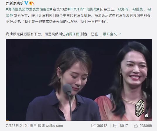 在前几天第13届FIRST青年电影展闭幕式上,海清也作为“中年女演员”代表发生,希望导演制片们给予她们更多的机会。