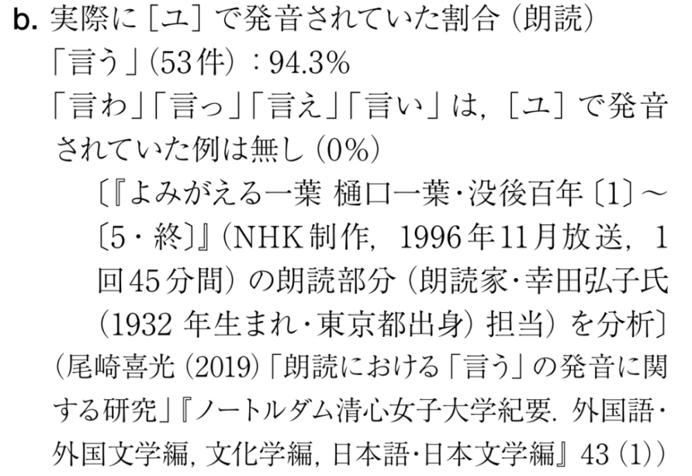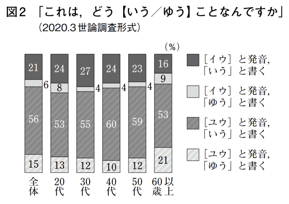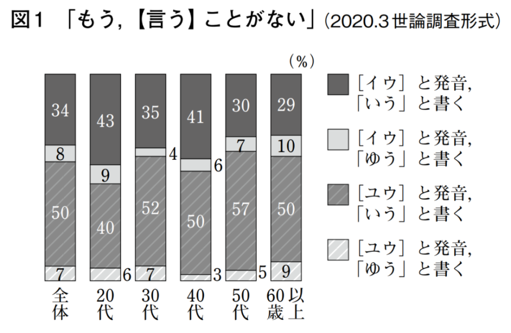 委员会引用了尾崎喜光曾在《清心语文》杂志上发表的论文《关于“言う”发音的研究》中的数据,结果如下: