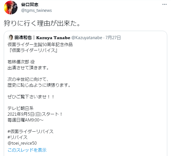 演员田边和也曾饰演《假面骑士AMAZONS》中的驱逐班成员福田耕太,这次的再参演,连“仁叔”谷口贤志也发来了祝贺互动!