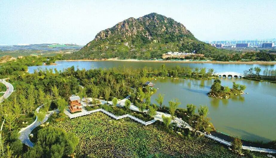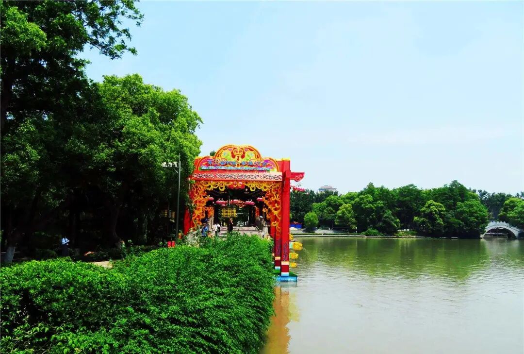 白鹭荷花映艳红,乌龙潭水掠清风。古刹逢春今日兴,真幸。小洲九片水山重。 湖面聚分桥一串,没断。潭平画舫荡其中。山野茂林幽雅绿,葱郁。公园六月夏方浓。