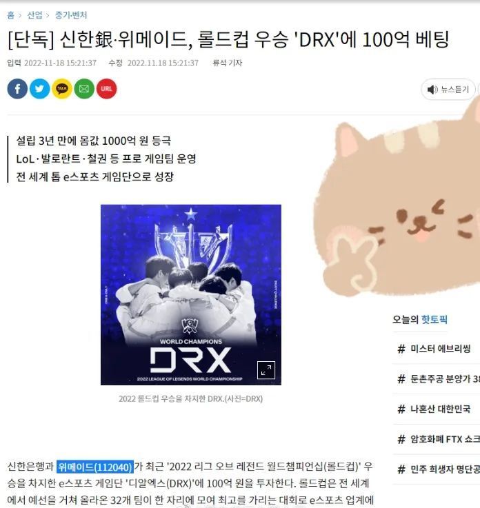 新韩银行和Wemade为DRX战队投资100亿韩元(约5KW人民币)