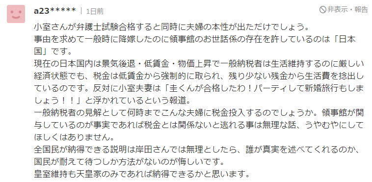 如今日本国内的经济状况是,经济发展后退、工资低、物价高,普通纳税者光是维持生活都很难了,国家还要从这么低的工资里榨出税金来,我们只能从少得可怜的工资里挤出生活费。相反的,小室夫妻却出现了“小圭终于考过了呀!我们开个派对去度蜜月吧!!”的报道。