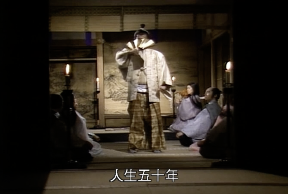 第二天,织田信长就在房间里跳了一段舞,这段舞蹈就是被许多电视剧演绎过的《敦盛》: