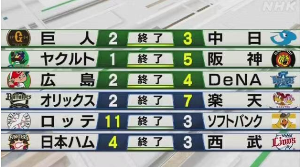 お終いにプロ野球6試合の結果です。